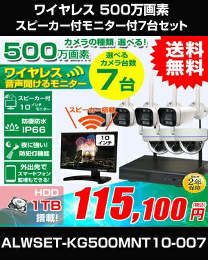 【家庭用防犯カメラ 無線・ワイヤレスカメラ】スピーカー内蔵10.1インチモニター付き 500万画素ハイビジョンワイヤレスカメラ カメラ種類選べる7台セット!画質で選ぶ!ワイヤレスカメラ録画機セット ALWSET-KG500MNT10-007