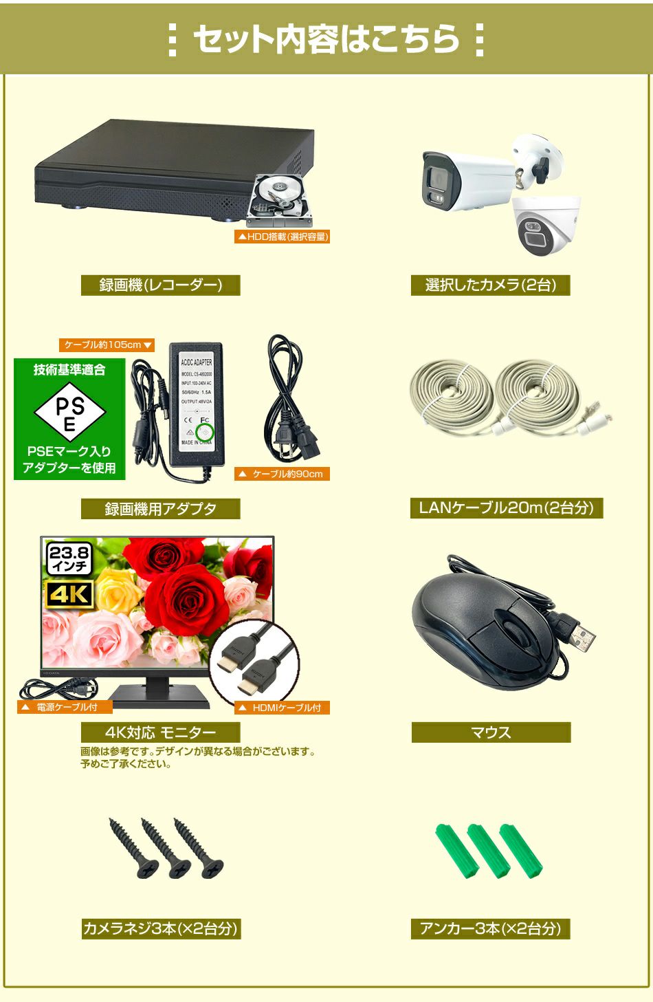 当セットは4K対応のモニターがセットになっています。モニターは何を買えばいいんだろう?などの不安も解消!弊社がセレクトした23.8インチの大型モニターとレコーダーはHDMIで簡単接続が可能!HDMIケーブルも付属しているので、すぐに使用開始!