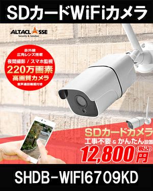 他の画像を見る マイク内蔵Wi-Fi防犯カメラ ご自宅のWiFiを使ったパソコン / スマホ / タブレットでの遠隔監視!SDカード式の録画機能搭載です。Wi-Fiがない環境でもAPモードで直接アクセスして使用可能! 工事不要 防犯カメラ 屋外 SDカメラ 録画機能付き 防水 WiFi SDカード 220万画素 AP機能搭載 防犯カメラ スマホ対応 赤外線カメラ SDカードカメラ 展示会やキッチンカー、ポップアップストア等でも使用実績 SHDB-WIFI6709KD 標準小売価格 ¥ 15,800 のところ 限定特価 ¥ 12,800 税込