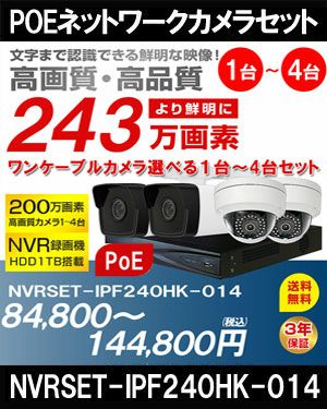 他の画像を見る ネットワークカメラセット POE機能でLANケーブルから電源供給可能!おすすめ 広角 屋外防水ネットワークカメラ1台~4台+録画機 スマホ監視対応 ワンケーブルで使える243万画素防犯カメラセットです。 防犯カメラ 屋外 録画機能付き 防水 逆光補正 広角 ネットワークカメラ 1台~4台セット 243万画素 POE LANケーブル スマホ対応 1TB H.265 常時録画 動体検知録画 防犯カメラセット カメラが選べる NVRSET-IPF240HK-014 標準小売価格 ¥ 180,000 のところ 当店特別価格 ¥ 84,800 税込