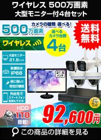 【家庭用防犯カメラ 無線・ワイヤレスカメラ】21.5インチモニター付き 500万画素ハイビジョンワイヤレスカメラ カメラ選べる4台セット!画質で選ぶ!ワイヤレスカメラ録画機セット ALWSET-KG500MNT-004