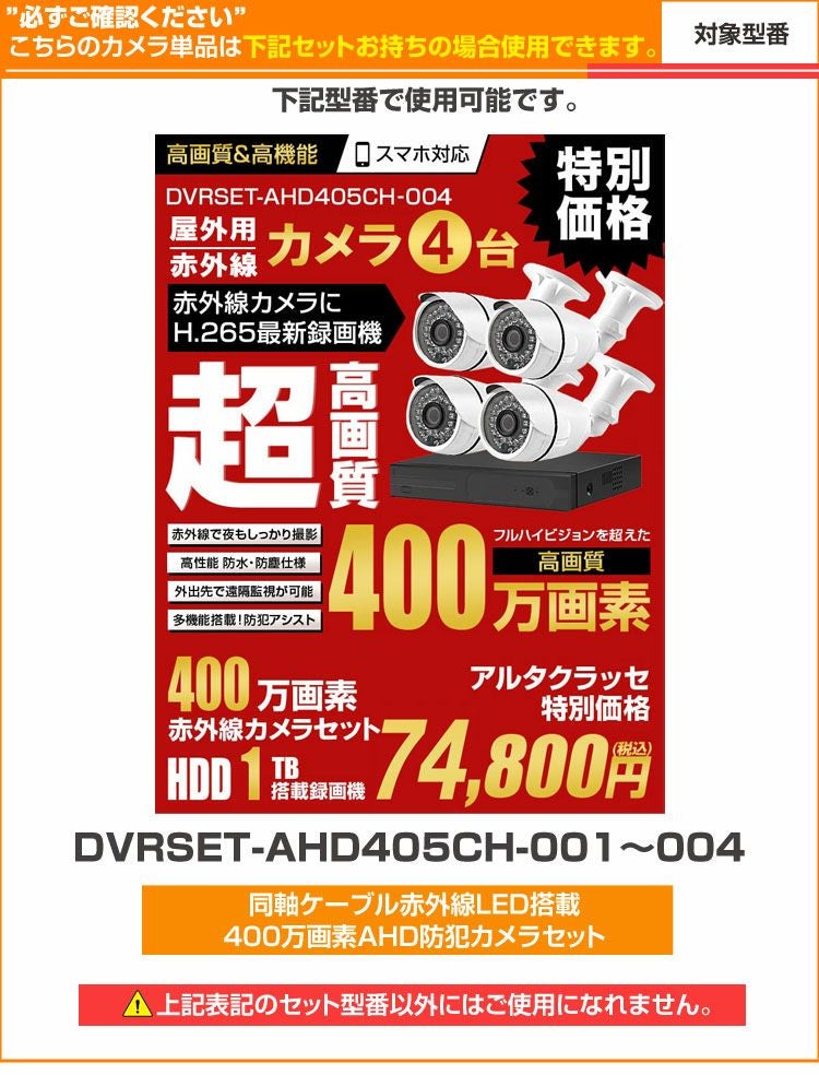 他の画像を見る 同軸400万画素オプションカメラ 増設用 セットをお持ちの際に、カメラを増やしたい時に 交換 バレットカメラのみ単品販売DVRSET-AHD405CH シリーズ用 赤外線防犯カメラ 屋外 (ご注意)カメラ単独では映りません /ALDB-AHD405-BULLET ¥ 11,800 当店特別価格 ¥ 9,800 税込