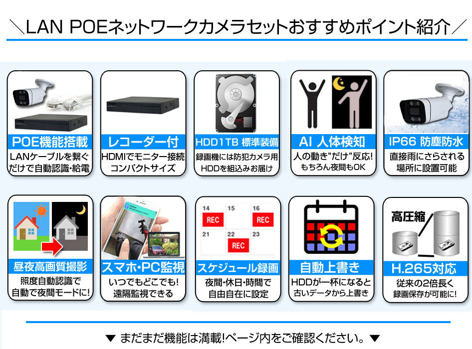 配線がLANケーブルのみのお手軽ネットワークカメラセット!レコーダーにPOE機能が搭載されておりLANケーブルを繋ぐだけで自動認識、電源供給されます!LANケーブル20mが付属しているのでお届けからすぐに使えるオールインワンセットです。