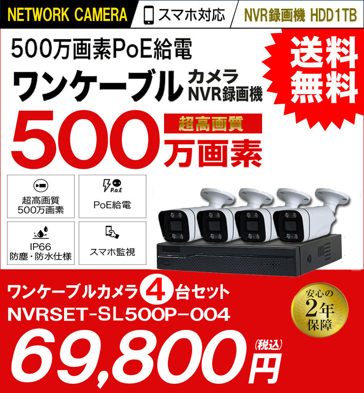 PoE ワンケーブル赤外線カメラ1~4台セット フルHD 1TB搭載 高性能 4ch NVRレコーダー(録画機) カメラ 1台 2台 3台 4台 NVRSET-SL500P-014
