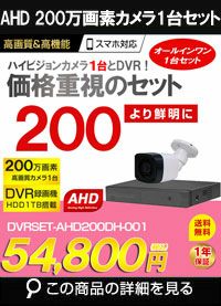 ※価格重視のお買い得セット! 200万画素 AHD 屋外用防犯カメラ1台&レコーダーセット!【オールインワンセット】【スマホ監視】防犯カメラ 1台セット AHD 200万画素 DVRSET-AHD200DH-001