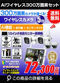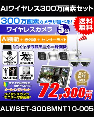 防犯カメラ 屋外 秋葉原 録画機能付き 防水 カメラ5台セット ワイヤレス 300万画素 マイク付き カメラ音声 10インチ液晶モニター付き 据え置き 壁掛け 人体検知 人感センサー ライト パソコン遠隔監視対応 バレット・ドーム・カメラが選べる 工事不要 防犯カメラセット ALWSET-300SMNT10-005