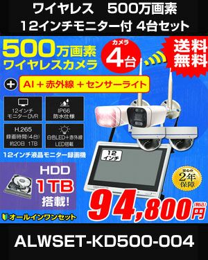 【家庭用防犯カメラ 無線・ワイヤレスカメラ】500万画素ハイビジョンワイヤレスカメラセット!画質で選ぶ!12.1インチ大型モニター録画機 500万画素ワイヤレスカメラ4台と受信機セット ALWSET-KD500-004