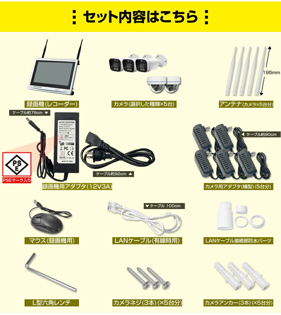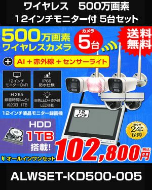 【家庭用防犯カメラ 無線・ワイヤレスカメラ】500万画素ハイビジョンワイヤレスカメラセット!画質で選ぶ!12.1インチ大型モニター録画機 500万画素ワイヤレスカメラ5台と受信機セット ALWSET-KD500-005