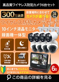 新型モデル防犯カメラ 屋外 秋葉原 録画機能付き 防水 カメラ6台セット ワイヤレス 300万画素 マイク付き カメラ音声 10インチ液晶モニター付き 人体検知 人感センサー ライト パソコン遠隔監視対応 バレット・ドーム・カメラが選べる 工事不要 防犯カメラセットALWSET-NWYG300-006