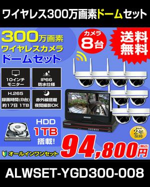【家庭用防犯カメラ 見守りカメラ 防犯対策】300万画素ハイビジョンワイヤレスカメラセット!画質で選ぶ!10.1インチ高画質液晶モニター付き録画機 300万画素ワイヤレスドームカメラ8台と受信機セット カメラ 8台 ALWSET-YGD300-008