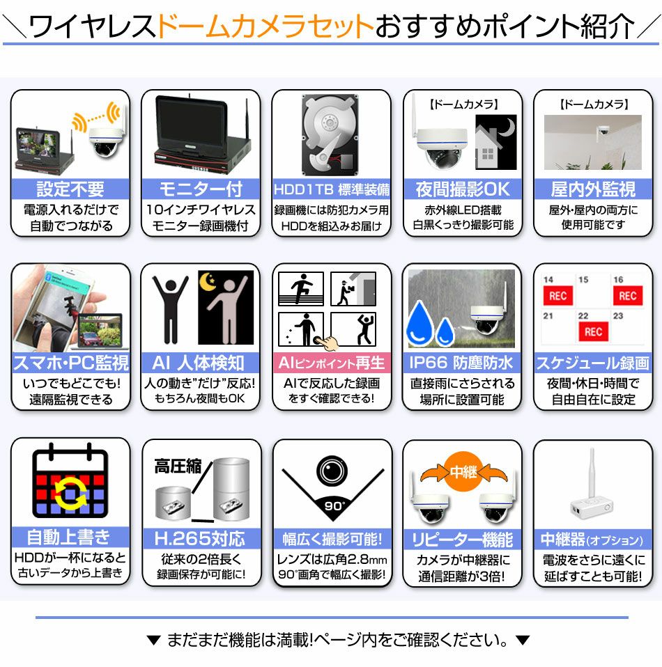 防犯カメラ AI機能 屋外 屋内 秋葉原 ドーム カメラ1~8台セット ワイヤレス 300万画素 録画機 HDD(1~4TB選択可) 防水 10インチ液晶モニター付き 人体検知 パソコン遠隔監視対応 ドームカメラ台数が選べる 工事不要 防犯カメラセット ALWSET-YGD300-018
