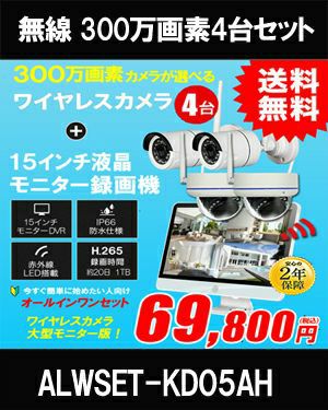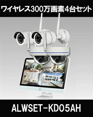 防犯カメラ 屋外 録画機能付き 防水 カメラ4台セット ワイヤレス 300万画素  15.6インチ液晶モニター付き バレット・ドーム・カメラが選べる 工事不要 防犯カメラセット ALWSET-KD05AH