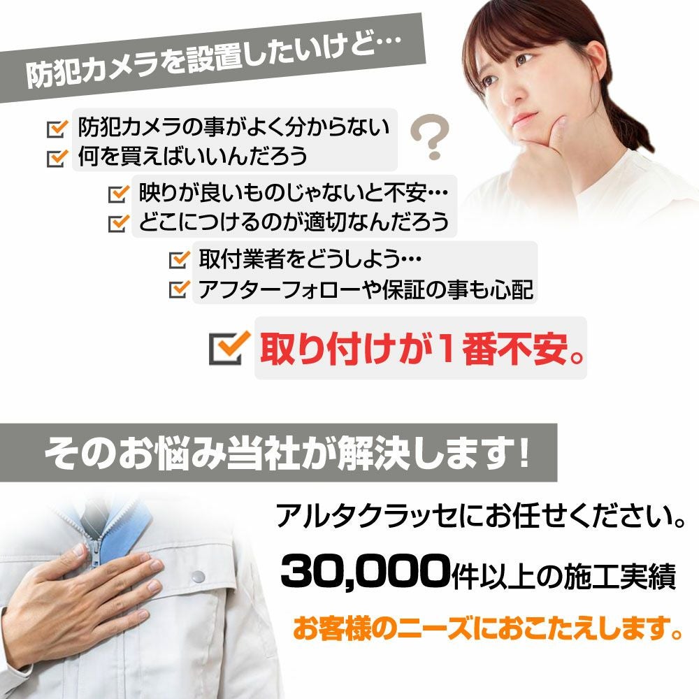 防犯カメラ設置のお悩みをプロが丁寧に解決します!何を買えばいいんだろう…映りがいいものがいい…取付業者どうしよう…そんなお悩みをアルタクラッセが解決!最適なご提案をさせていただきます。