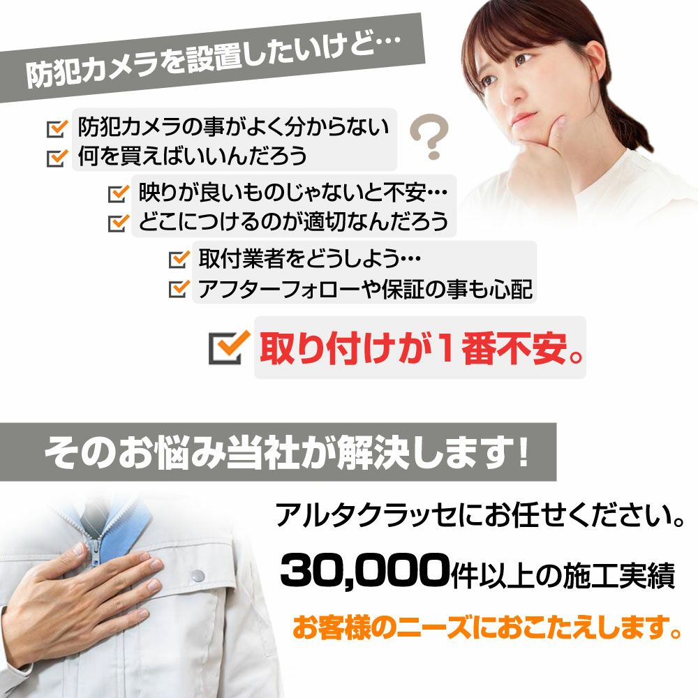 アルタクラッセでは、ネットワークカメラ、防犯カメラ、監視カメラの選び方・取り付け方、設置工事のご相談に応じています。お気軽にお問い合わせ下さい。熟練の防犯設備士が対応いたします。