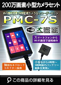 • PMC-7SはWi-Fi機能を搭載した、小型カメラと高性能レコーダーで構成される特殊撮影機材です。 Wi-Fiモデル初となる液晶タッチパネルを搭載し、本体上やスマホ、タブレットから設定の変更や録画データの再生が可能になりました。 カメラ部にはナチュラルな外観で高い秘匿性をもたらすネジ・ボタンに擬装可能な特殊レンズカバーと、あらゆる場所への設置を可能にする加工用ブラケットを付属します。 コンパクトにデザインされたレコーダーユニットとの組み合わせは、多彩なシーンに対応可能です。