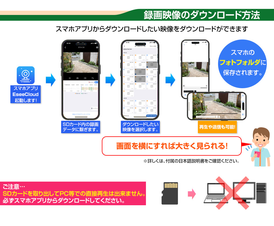 Wi-Fi防犯カメラ ご自宅のWiFiを使ったパソコン / スマホ / タブレットでの遠隔監視!SDカード式の録画機能搭載です。Wi-Fiがない環境でもAPモードで直接アクセスして使用可能!