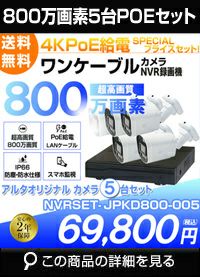 商品名 ネットワークカメラ 屋外 POE LANケーブル ワンケーブル カメラ5台セット 800万画素 NVR HDD 1TB 監視カメラ フルハイビジョン 高画質 防水 赤外線 暗視 8ch 録画機 レコーダー 動体検知 家庭用 防犯カメラセット 【送料無料】 NVRSET-JPKD800-005